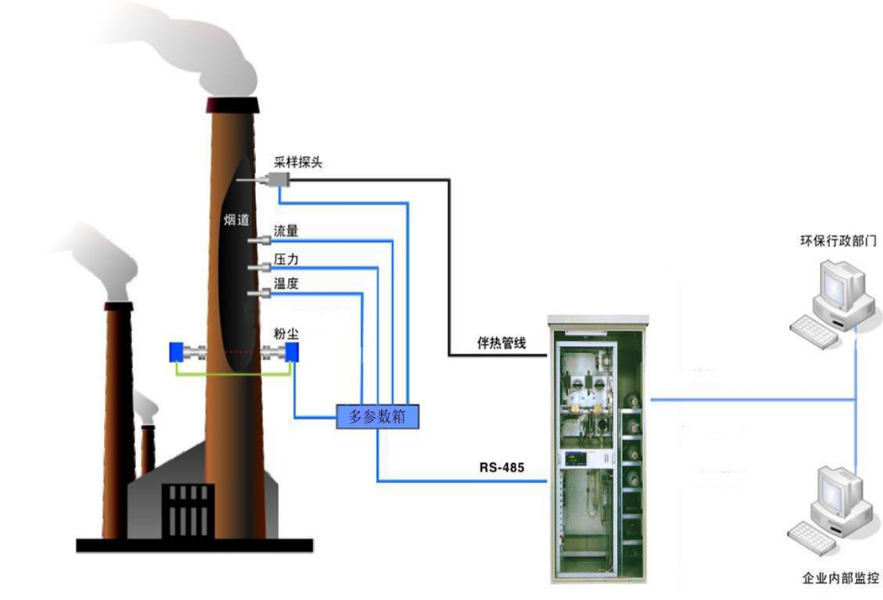 通過(guò)加熱抽取法(抽取冷凝法)將煙道中氣體取出并輸送到預(yù)處理單元,預(yù)處理單元將煙道中的氣體經(jīng)預(yù)處理后送入分析儀表。通過(guò)在線氣體分析儀表(煙氣分析儀)對(duì)煙氣中多種污染物進(jìn)行連續(xù)監(jiān)測(cè),將測(cè)量數(shù)據(jù)顯示在儀表上,最后通過(guò)環(huán)保數(shù)采儀將監(jiān)測(cè)數(shù)據(jù)實(shí)時(shí)傳到環(huán)保監(jiān)控網(wǎng)絡(luò)。
